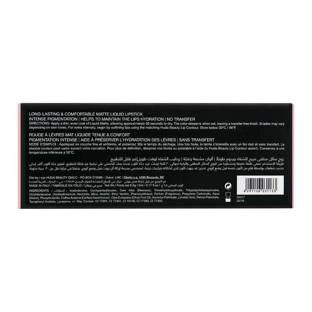 Huda Beauty Liquid Matte Lipstick Crush 6.5g delivers intense color payoff with a lightweight, transfer-proof matte finish. Its comfortable, long-lasting formula glides effortlessly across the lips, providing full coverage in a single swipe without drying. The shade Crush is a soft, romantic hue that flatters a wide range of skin tones, perfect for everyday wear or a subtle glam look.