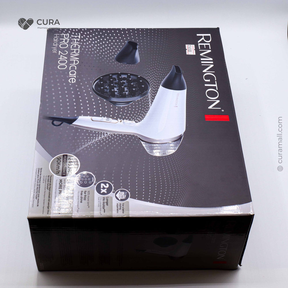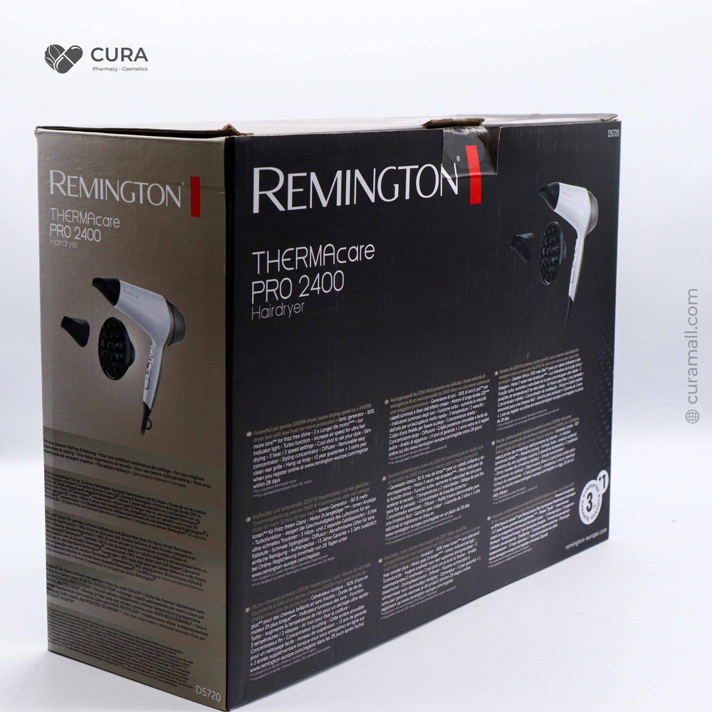 The Remington Hair Dryer AC5720 is a salon-quality dryer designed with a powerful AC motor to deliver fast drying and professional results. Featuring advanced Ionic conditioning and Ceramic technology, it helps reduce frizz, enhances shine, and protects hair from heat damage. With multiple heat and speed settings, plus a cool shot button, it offers full control over styling. The lightweight design and included attachments make it ideal for all hair types and everyday use.