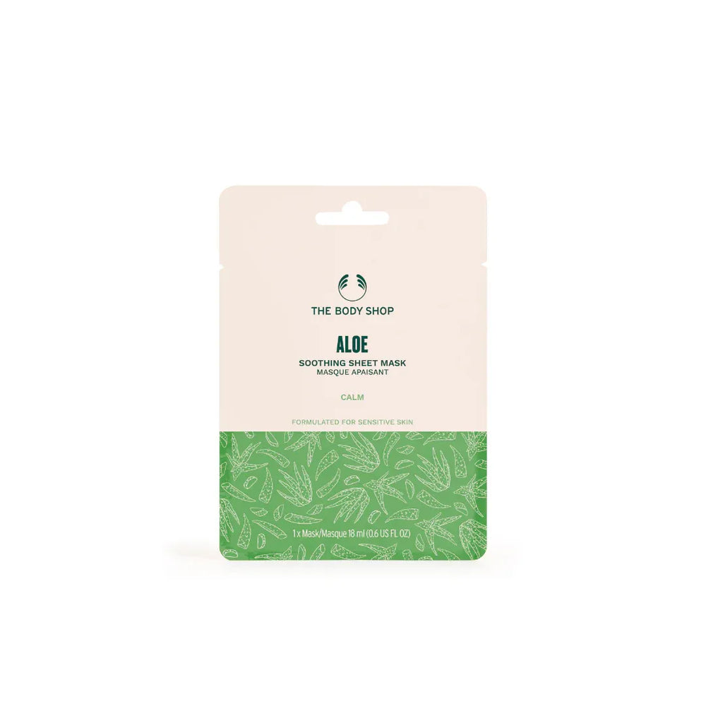 The Body Shop Aloe Soothing Sheet Mask Calm is a refreshing, single-use sheet mask designed to instantly hydrate and comfort sensitive and dry skin. Enriched with Community Fair Trade aloe vera from Mexico, this ultra-soothing mask helps calm irritation, reduce dryness, and restore moisture for a soft and refreshed complexion. Its lightweight fabric hugs the contours of the face, delivering a concentrated boost of hydration in just 15 minutes.